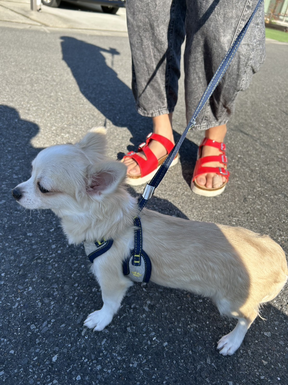 初めてのお散歩では、外の音や車に少し緊張しながらも、歩く姿がとても可愛くて、
