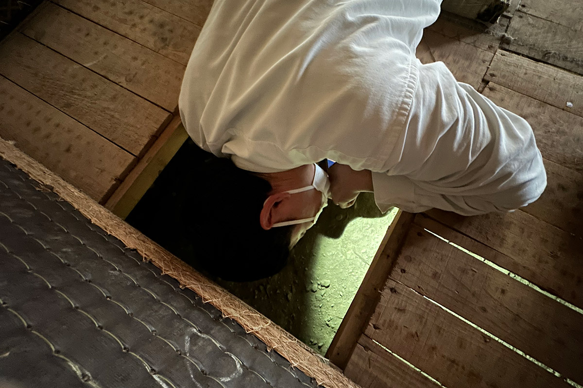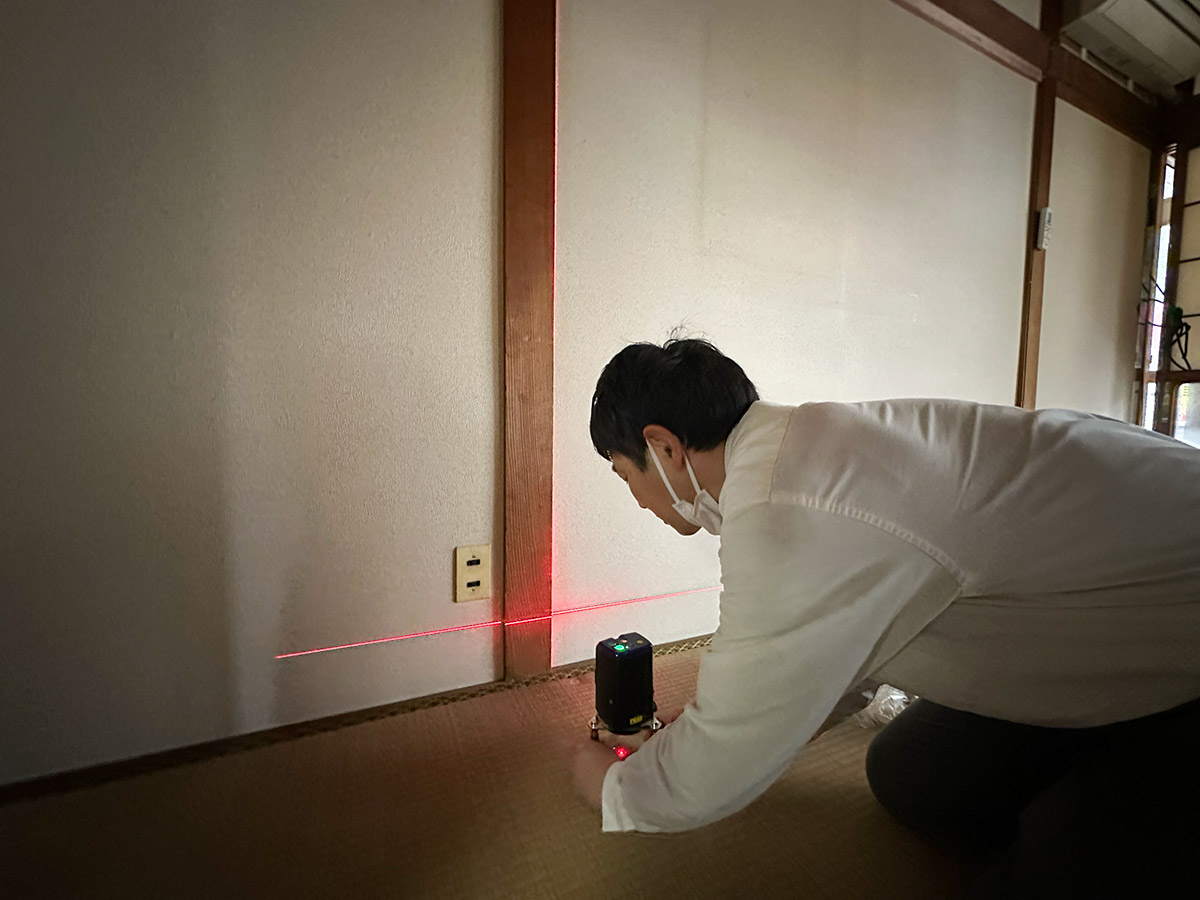 インスペクション(建物現況調査)の様子。専門の建築士が基礎・柱・梁などの構造部分や、屋根・外壁などの雨水浸入防止部分を目視や計測器で検査します