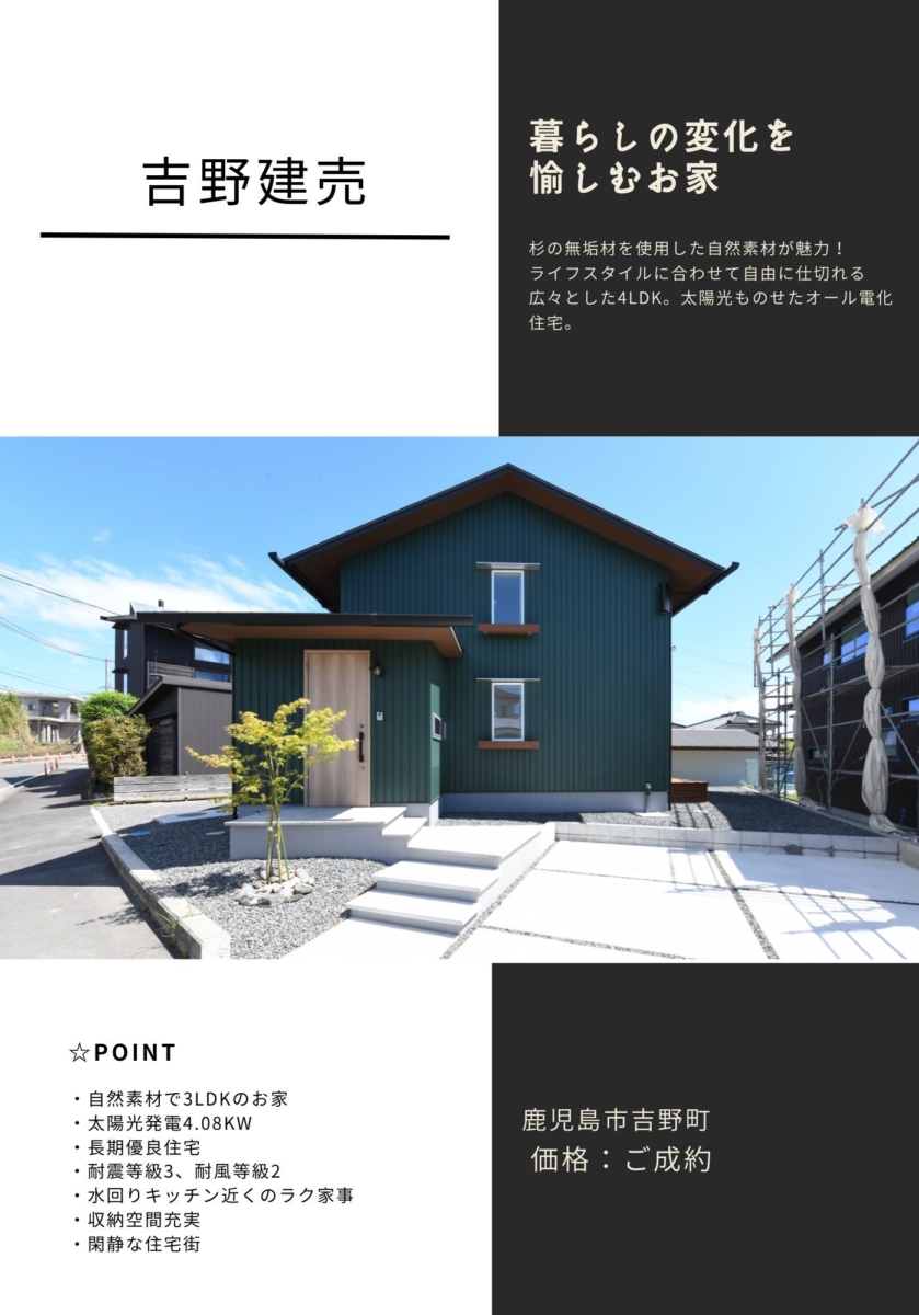 売主 ご成約!リビングに自然と家族が集まる、暮らしの変化を愉しむ家【吉野新築建売】 (物件番号:吉野建売モデル4)