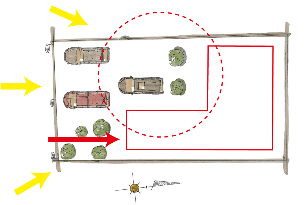 01. 敷地を読む 設計で一番大切な「配置計画」 家を建てる上で一番大切な事はその土地をどう生かして建物を建てるかという事です。 土地ごとに、周辺環境や町並み、土地の形状、隣地の建物と窓の位置、方位、太陽の角度、風向き、眺望や見たくない場所、高低差や建築基準法など様々な条件があります。 それをどう読み解くかが一番大切な事なのです。 それを読み間違えると、豊かな暮らしから遠ざかってしまいます。 例えば、前面道路にリビングが面していて中が丸見え、風通しが悪くジメジメしてカビの匂いがする建物。 かっこよく大きな開口部を開けたものの、いつもカーテンは閉めっぱなし。 後から「しまった!」と思っても後の祭りなのです。 私たちは、敷地を生かすポイントとして次の事に気を付けます。 近隣への配慮・変化への対応・町並みや景観 駐車スペースの位置とかたち・方位 太陽の道 アプローチの動線と建物の見え方 活かせるスペースと捨てるスペース 道路との関わり方・高低差の使い方 すべてが良い土地では無いはずです。 しかし、その土地その土地にそれぞれの答えや考え方があるはずです。 特に土地をお持ちでない方は土地探しから始めなければなりませんが、その際は土地をどう読み解くかが大切です。 土地の見極め方を詳しく知りたい方はお気軽にご相談ください。 <敷地を読み解くプランの一例> 建設前の敷地のようす01 建設前の敷地のようす02 01.まずは土地を見て、 その土地の活かし方、一番いい場所を確認します。 まずは敷地を道路から見るのは当然ですが、敷地の真中に立って360度周りにどんな建物が建っているか、方位的にどこが一番いい場所か、何処に車を配置するか、眺望や抜け感、日当たり、風の通りを確認します。 その時に注意すべき事は空き地や古い建物です。 なぜならそこに将来建物が建つ可能性が有るからです。 02.初めに車を停める位置を決めます 車の配置は毎日の事なので重要です。これを間違えると取り返しがつきません。 合わせてシンボルツリーなど木を植える場所を決めていきます。 03.周りの環境に合わせて配置計画 太陽の角度と位置、周りの環境に合わせて配置計画をします。一番いい場所に植栽を置き、どこを開きどこを閉じるかを計画します。 04.道路から玄関までのアプローチ 道路から玄関までのアプローチ、そこに植栽がある事で季節感が感じられ、周囲の街並みを豊かにする事が出来ます。 05.窓の位置が重要です 窓のレイアウトは重要なポイントです。 光や風を取り込む、風景を切り取る、正面からの印象を美しく見せる、視線を運び抜ける止めるを表現する。 取付位置や窓の選定を決めていきます。 06.家族の暮らし方、想いを形にする そこに家族の想い、暮らし方が形となってまとまってきます。趣味やこだわりの場所がちゃんと機能できるようにまとめていきます。 07.建物のバランスと美しさを整える 最終的に道路からその建物がどのように見えるか、バランスと美しさを意識しながら設計していきます。 08.家づくりは「プラン」が肝心です 家づくりは最初の「プラン」がとても肝心です。 このとき敷地の読み方を間違えると居心地の悪い家になってしまうことも・・・・。 家づくりの良し悪しの80%がこの「プラン」で決まると言って過言ではありません。 ▲ここちよさの6つの要 02.窓の役割▶︎